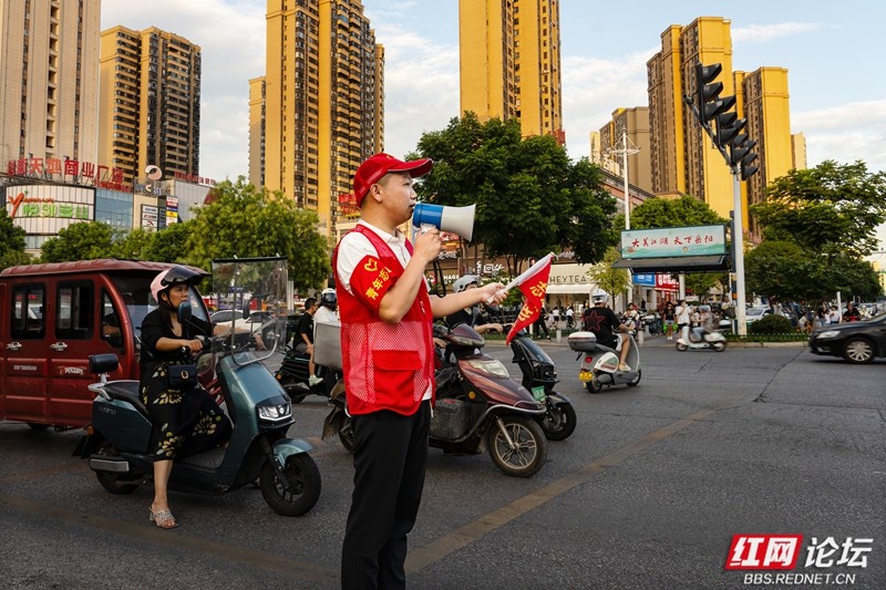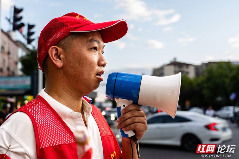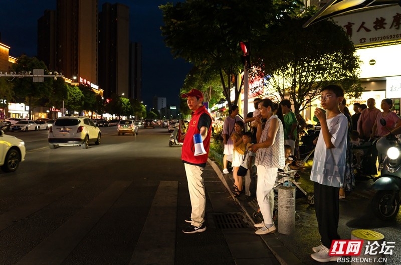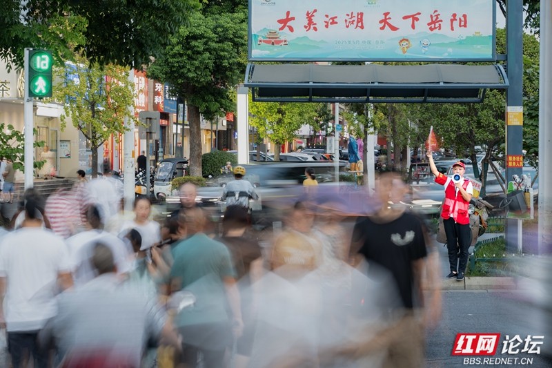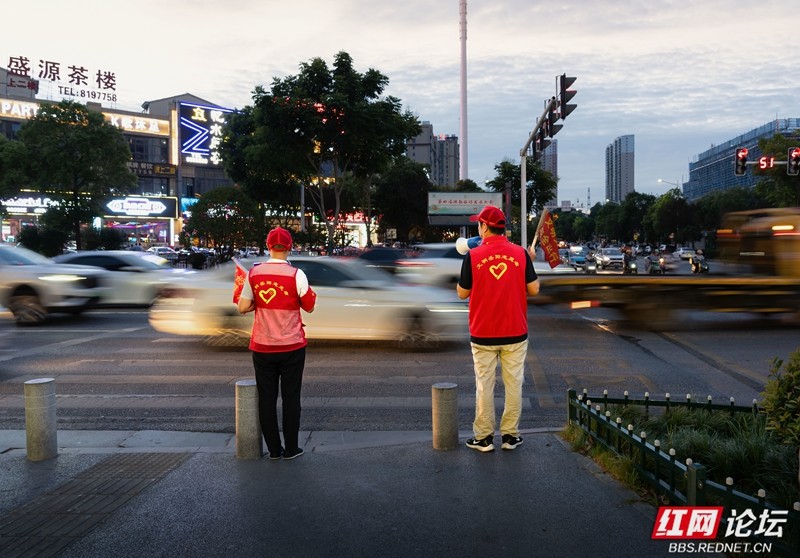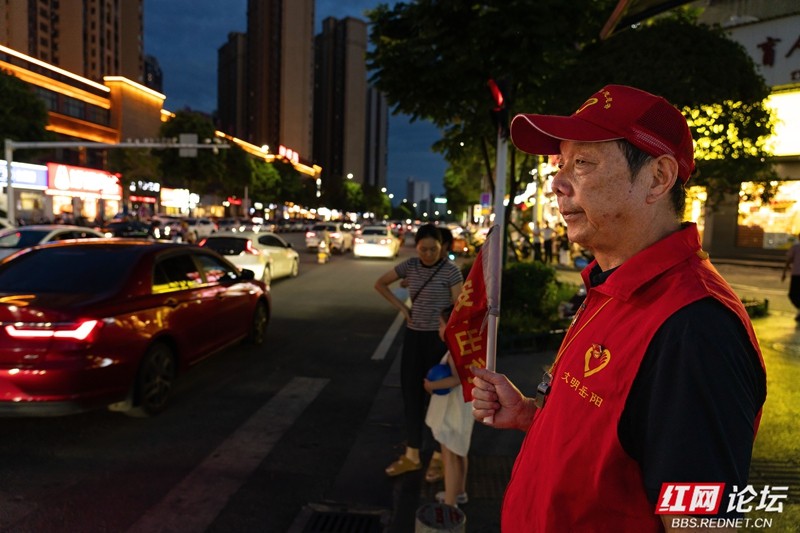 8月23日,夜幕如同一块深蓝绸缎,悄然笼罩在岳阳洛王新天地上空。车水马龙的红绿灯路口,华灯初上,宛如点点星辰落入人间,点亮了城市的夜晚。而在每晚6点40分至8点40分这个固定时段,总有两位令人肃然起敬的志愿者,如约出现在熙攘的人群与车流之中。